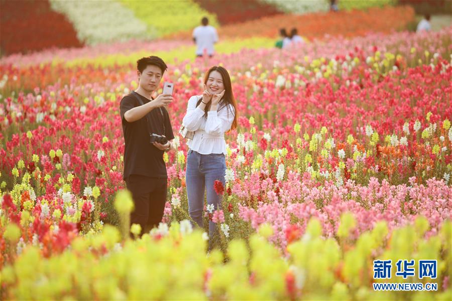 5月1日,游客在四川省遂寧市圣蓮花開景區(qū)的金魚草花海中拍照?!拔逡弧奔偃掌陂g,人們以多種方式放松心情、享受假日。新華社發(fā)(劉昌松攝)