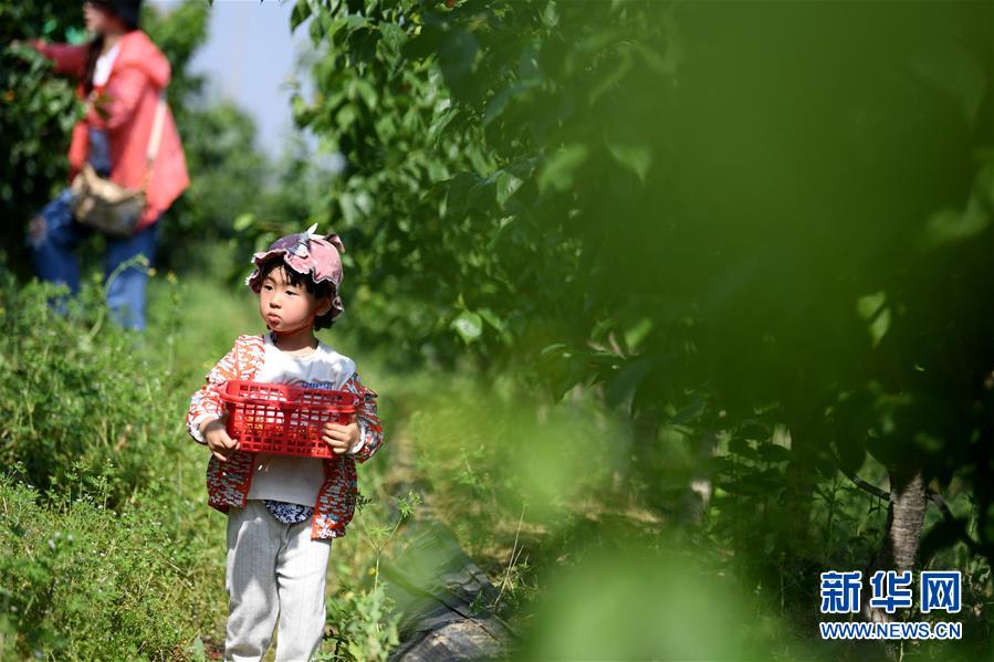 5月3日,游客在豐樂鎮(zhèn)鳳嶺苗木種植扶貧產(chǎn)業(yè)園里體驗(yàn)采摘櫻桃。新華社記者劉軍喜攝
