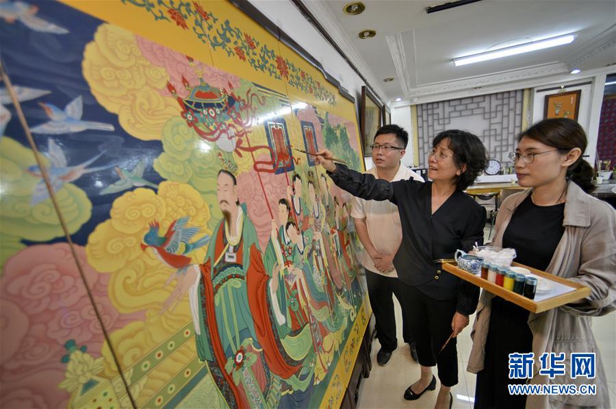 5月4日拍攝的采用金漆鑲嵌彩繪工藝?yán)L制完成的承恩寺壁畫屏風(fēng)《帝后放飛圖》。新華社記者 李欣 攝
