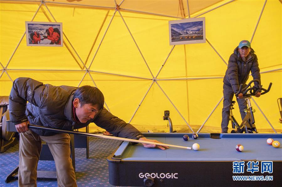 登山隊(duì)員在珠峰大本營(yíng)內(nèi)打臺(tái)球(5月1日攝)。新華社記者孫非攝