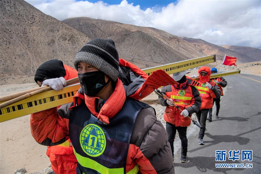 在西藏定日縣曲當鄉(xiāng)境內,國測一大隊隊員前往水準測量點(4月18日攝)。水準測量是一種利用提供水平視線的儀器(如水準儀、水準標尺),測定地面不同點之間的高差,并以此推算高度的一種方法,是經典大地測量的重要技術之一。在目前正在進行的2020珠峰高程測量中,部分國測一大隊隊員承擔了水準測量的任務。新華社記者孫非攝