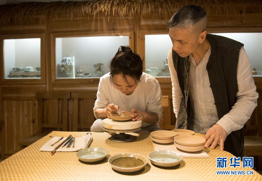5月8日,“90后”瓷人湯佳(左)在龍泉青瓷裝飾紋樣研究所對著項宏金收藏的古瓷器刻劃魚紋盤。1965年出生的項宏金,被浙江龍泉年輕一代瓷人稱為“項哥”,他從20世紀90年代開始收集龍泉青瓷標本,研究青瓷紋樣。2014年出版著作《龍泉青瓷裝飾紋樣》,次年開設(shè)龍泉青瓷裝飾紋樣研究所,將自己收藏的千余件標本跟瓷器愛好者、創(chuàng)作者免費分享。新華社記者翁忻旸攝
