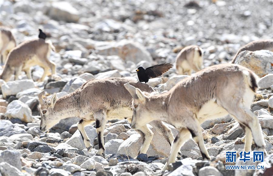 黃嘴山鴉停留在巖羊身上(5月8日攝)。當(dāng)日,一群巖羊在珠峰大本營(yíng)周?chē)捠?,黃嘴山鴉飛到巖羊身上停留,構(gòu)成一幅幅生動(dòng)有趣的雪域圖畫(huà)。新華社記者晉美多吉攝