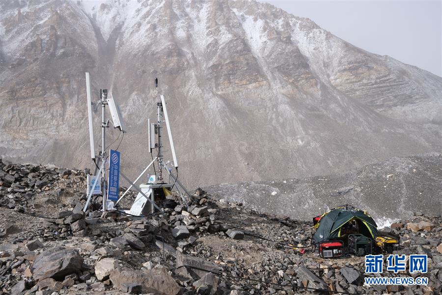 過渡營地附近的中國移動基站(5月8日攝)。珠峰過渡營地海拔5800米,是連接前進營地和珠峰大本營的重要一站。登山愛好者從大本營徒步大約四個小時就能抵達過渡營地。此段路程亂石林立,同時也能欣賞壯美的冰川。新華社記者孫非攝