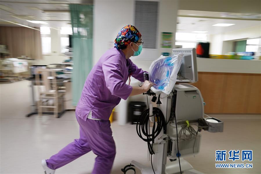 5月10日,在上海市普陀區(qū)中心醫(yī)院內(nèi)科重癥監(jiān)護(hù)室,護(hù)士來(lái)文健在推運(yùn)設(shè)備。新華社記者劉穎攝