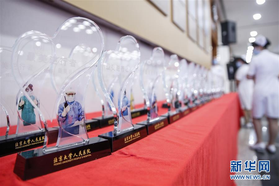 5月11日,工作人員整理印有援鄂隊(duì)員工作照的獎(jiǎng)杯。在國際護(hù)士節(jié)到來之際,北京大學(xué)人民醫(yī)院11日舉辦慶祝護(hù)士節(jié)暨優(yōu)秀集體和個(gè)人表彰活動,并邀請?jiān)踽t(yī)療隊(duì)護(hù)士代表分享戰(zhàn)“疫”故事。我國今年護(hù)士節(jié)的主題為“致敬護(hù)士隊(duì)伍,攜手戰(zhàn)勝疫情”。新華社記者張玉薇攝