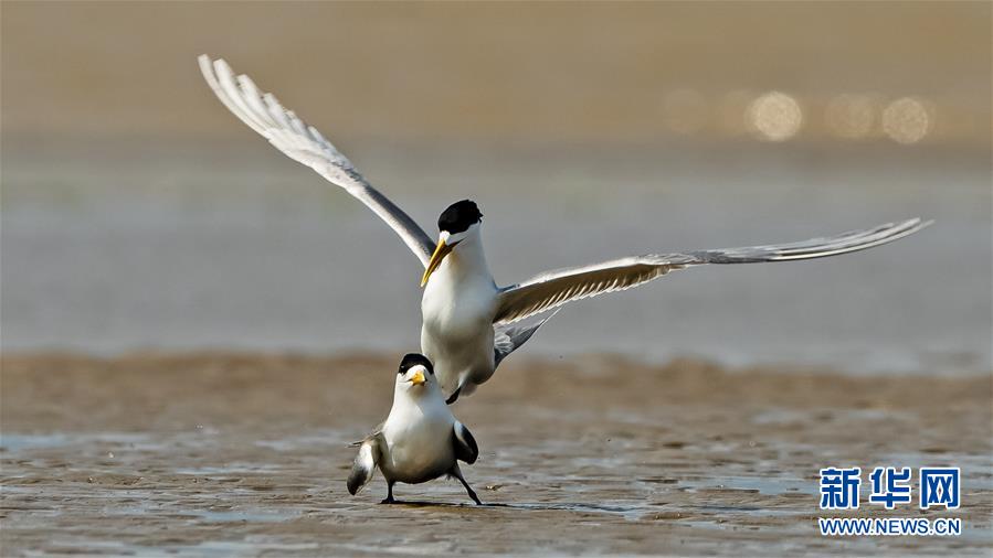 眼下正是大鳳頭燕鷗繁育的時(shí)節(jié),在福建閩江河口濕地核心區(qū)鱔魚灘的沙洲上,大鳳頭燕鷗正相互嬉戲(5月9日攝)。新華社記者梅永存攝