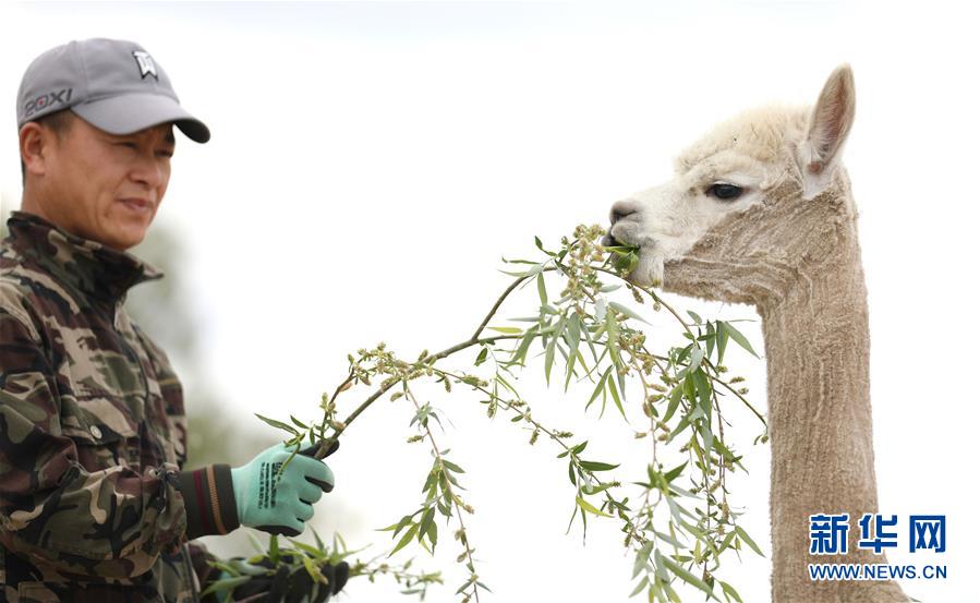 5月12日,飼養(yǎng)員在喂食一只剪下絨毛的羊駝。新華社記者姚劍鋒攝