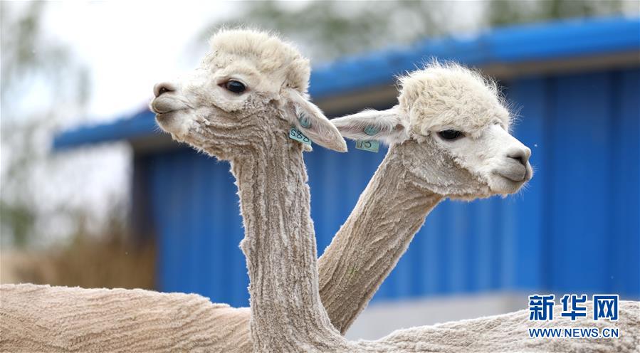 5月12日,兩只剪下絨毛的羊駝在養(yǎng)殖基地的飼養(yǎng)舍里。新華社記者姚劍鋒攝