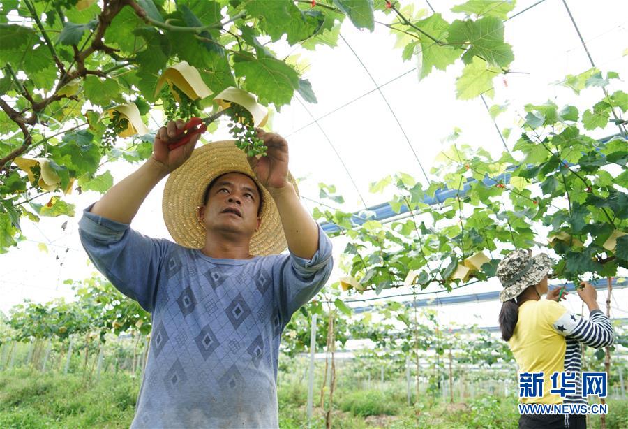 5月13日,在福建省建甌市小橋鎮(zhèn)陽(yáng)澤村誠(chéng)源果蔬專(zhuān)業(yè)合作社,村民在修剪葡萄枝葉。誠(chéng)源果蔬專(zhuān)業(yè)合作社有葡萄園100多畝,產(chǎn)品供應(yīng)北京上海市場(chǎng),村民可以在葡萄園內(nèi)從事季節(jié)性工作。新華社記者賀燦鈴攝
