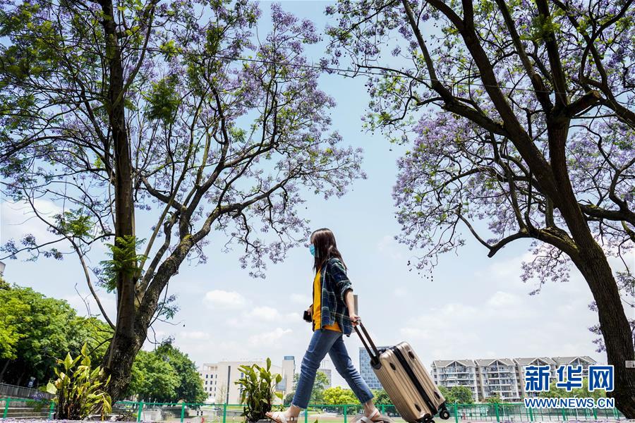 5月15日,西南大學校園內的藍花楹樹下,一名學生拖著行李箱向宿舍走去。當日,重慶西南大學迎來疫情以來首批返校大學生。據(jù)介紹,按照疫情防控的需要,重慶市高校2020年春季學期從5月11日起按照“一校一策”原則,實行錯峰錯時分批次有序開學復課。新華社記者劉潺攝