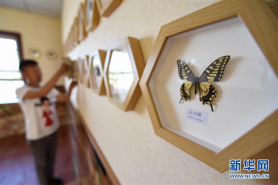 在吉木薩爾縣七彩蝶園,關富云在打掃蝴蝶標本展廳(5月15日攝)。新華社記者丁磊攝