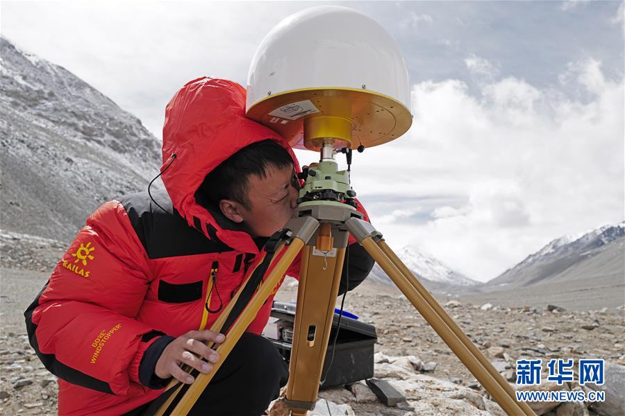 國測一大隊隊員在珠峰大本營附近測試設備(4月27日攝)。新華社記者普布扎西攝