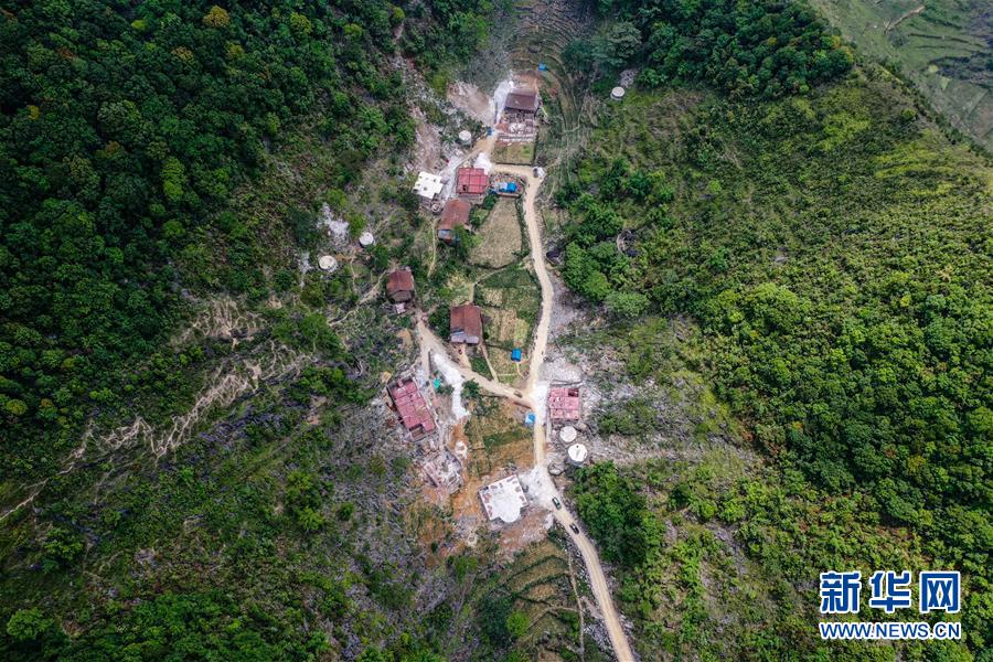 這是大化瑤族自治縣七百弄鄉(xiāng)弄合村弄根屯在進(jìn)行危房改造和修建進(jìn)屯路(5月13日攝,無(wú)人機(jī)照片)。
