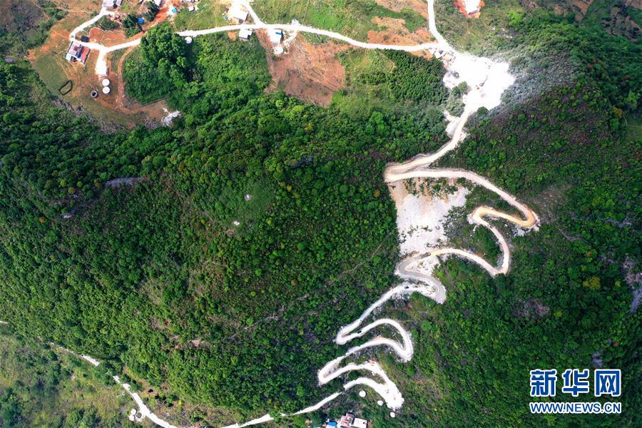 這是在進行路面硬化的大化瑤族自治縣弄合村弄魯屯至弄確屯的山路(5月13日攝,無人機照片)。新華社記者周華攝