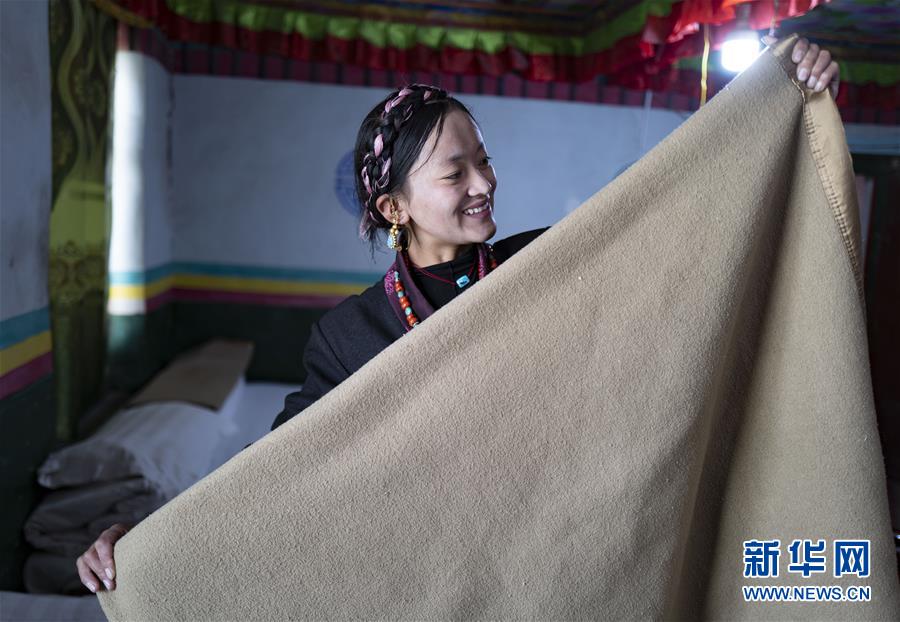 “牛頭旅館”老板多吉的兒媳在旅館里整理被褥(5月17日攝)。新華社記者普布扎西攝