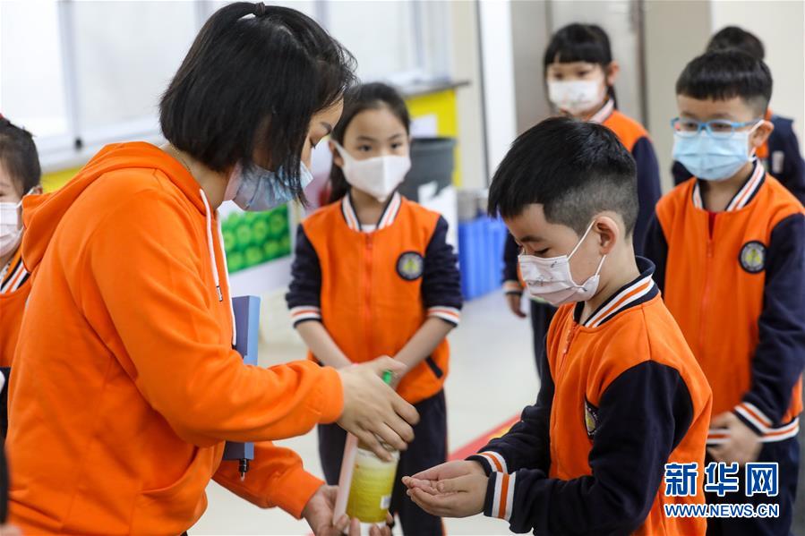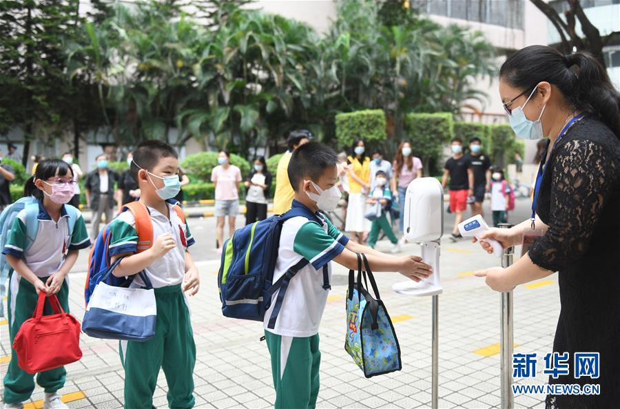5月25日,廣州市荔灣區(qū)蔣光鼐紀(jì)念小學(xué)的老師在校門口指導(dǎo)返校的學(xué)生進行手部消毒。當(dāng)日,廣州市各小學(xué)一至三年級學(xué)生正式開學(xué)復(fù)課。至此,廣州市中小學(xué)各年級已全部開學(xué)復(fù)課。新華社記者盧漢欣攝