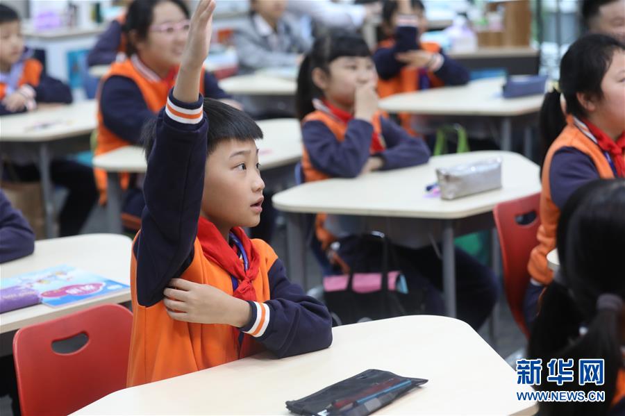 5月25日,貴陽市南明區(qū)苗苗實驗學(xué)校的學(xué)生在課堂上舉手回答問題。新華社記者楊文斌攝