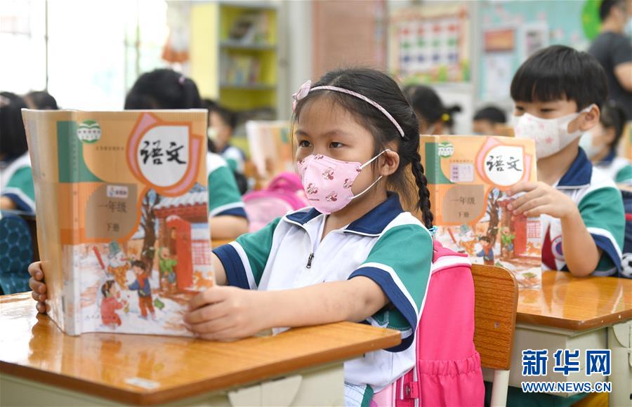 5月25日,廣州市荔灣區(qū)蔣光鼐紀(jì)念小學(xué)的學(xué)生在朗讀。當(dāng)日,廣州市各小學(xué)一至三年級學(xué)生正式開學(xué)復(fù)課。至此,廣州市中小學(xué)各年級已全部開學(xué)復(fù)課。新華社記者盧漢欣攝