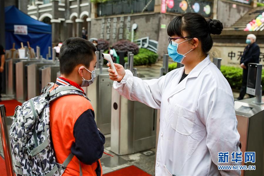 5月25日,貴陽市中天北京小學(xué)未來方舟校區(qū)學(xué)生在返校時進行體溫檢測。新華社記者歐東衢攝