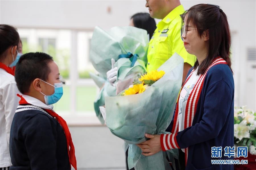 5月25日,北京市朝陽區(qū)實驗小學(xué)貴陽分校的學(xué)生在上開學(xué)第一課時,為前來講課的抗疫醫(yī)生送上鮮花。新華社記者劉續(xù)攝