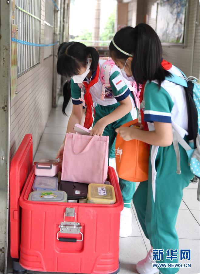 5月25日,廣州市荔灣區(qū)蔣光鼐紀念小學的學生將自帶的飯盒放在教室門口的箱子里,工作人員將為學生統(tǒng)一配餐。當日,廣州市各小學一至三年級學生正式開學復課。至此,廣州市中小學各年級已全部開學復課。新華社記者盧漢欣攝
