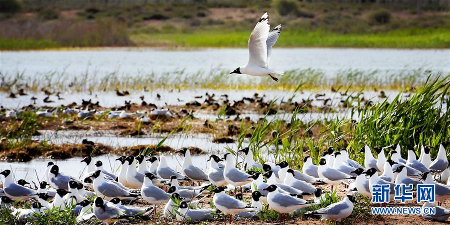 5月27日在陜西省神木市紅堿淖拍攝的遺鷗。陜西省神木市紅堿淖是中國最大的沙漠淡水湖,近年來隨著周邊生態(tài)環(huán)境改善,紅堿淖水位逐年提升,水域面積不斷擴(kuò)大,每年四至八月,都會吸引大批遺鷗來此繁衍棲息,已成為遺鷗繁殖的重要基地。新華社記者陶明攝