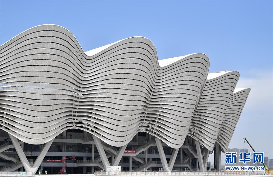 5月29日,工人在西安奧體中心游泳館施工。新華社記者張博文攝