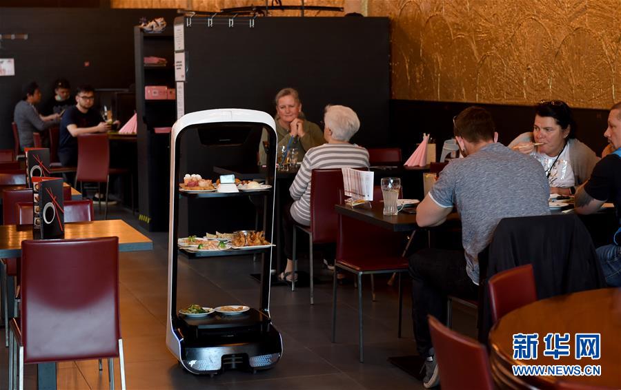 5月28日,在奧地利維也納一家亞洲餐廳內(nèi),機(jī)器人給顧客上菜。維也納的一家亞洲餐廳于疫情期間重新營業(yè)后,更多利用機(jī)器人上菜,以減少服務(wù)員和顧客之間的非必要接觸。新華社記者郭晨攝