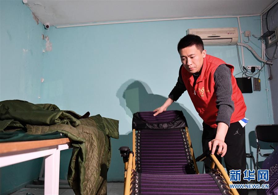 楊龍明在小區(qū)內(nèi)的值班室整理躺椅,到后半夜的時(shí)候只能在這里稍微休息一下(6月1日攝)。新華社記者李然攝。