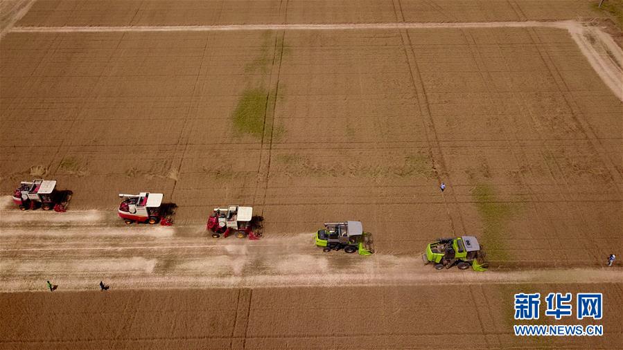 6月3日,收割機(jī)在汶上縣郭倉(cāng)鎮(zhèn)的麥田里收獲小麥(無(wú)人機(jī)航拍)。目前,我國(guó)第二大小麥主產(chǎn)區(qū)山東6000多萬(wàn)畝小麥進(jìn)入收獲階段。農(nóng)民們搶抓有利天氣,自南向北陸續(xù)開鐮。新華社記者郭緒雷攝。