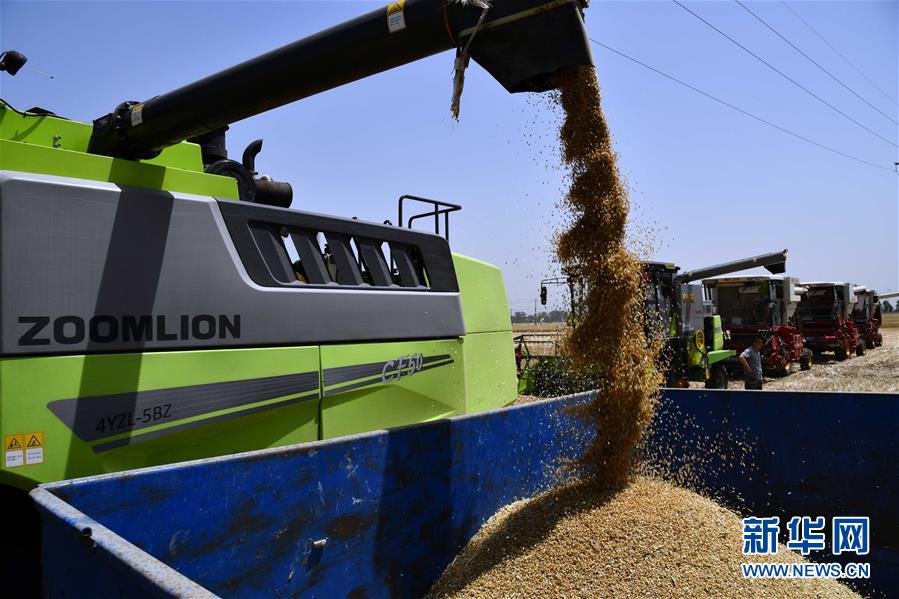6月3日,在汶上縣郭倉鎮(zhèn),收割機在收獲小麥。目前,我國第二大小麥主產(chǎn)區(qū)山東6000多萬畝小麥進入收獲階段。農(nóng)民們搶抓有利天氣,自南向北陸續(xù)開鐮。新華社記者郭緒雷攝。