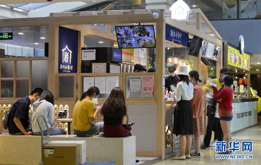6月3日,市民及游客在西單大悅城商場(chǎng)內(nèi)購(gòu)買食品。近日,游人和市民紛紛來(lái)到北京市的王府井、西單、前門大街等著名商業(yè)街購(gòu)物休閑,這些老商業(yè)街開(kāi)始逐步恢復(fù)昔日的繁華。新華社記者李欣攝。