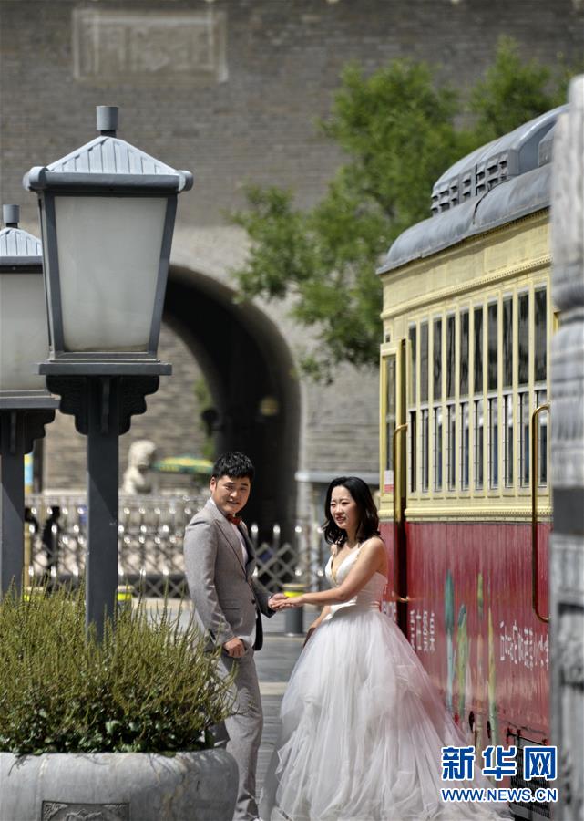 6月3日,一對(duì)年輕人在前門(mén)步行街拍攝婚紗照片。近日,游人和市民紛紛來(lái)到北京市的王府井、西單、前門(mén)大街等著名商業(yè)街購(gòu)物休閑,這些老商業(yè)街開(kāi)始逐步恢復(fù)昔日的繁華。新華社記者李欣攝。