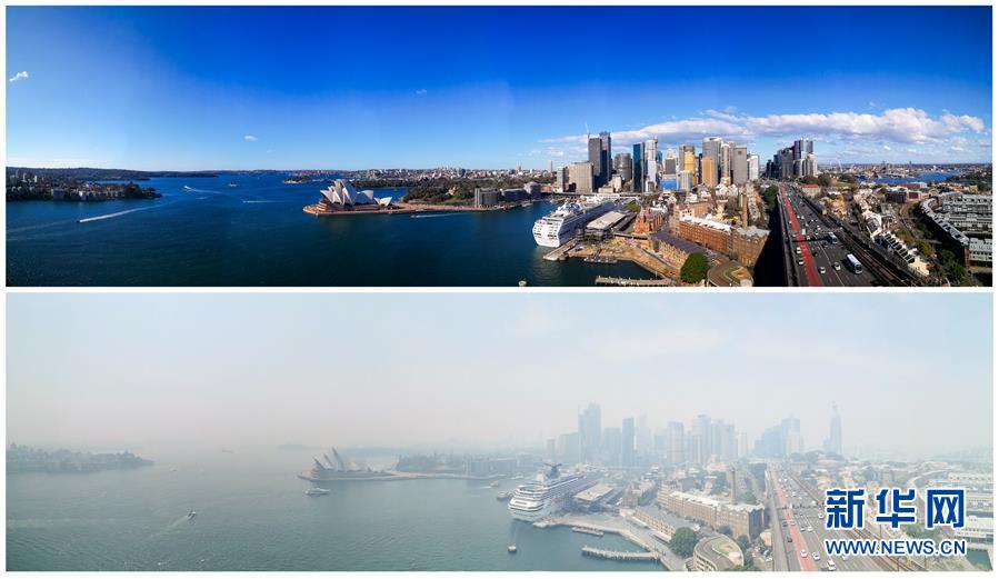 這張拼版照片顯示的是2018年7月6日(上)和2019年12月19日拍攝的澳大利亞悉尼港區(qū)的空氣質(zhì)量對比效果。2019年中至2020年初,持續(xù)半年左右的澳大利亞森林火災(zāi)造成嚴(yán)重的環(huán)境災(zāi)難。6月5日是第47個聯(lián)合國世界環(huán)境日,今年的主題為“關(guān)愛自然刻不容緩”。新華社記者白雪飛攝。