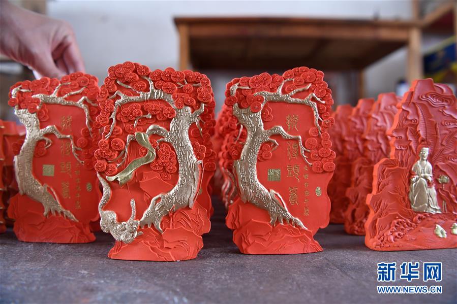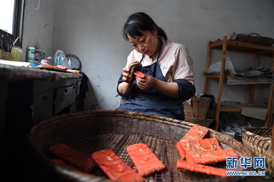 5月20日,安徽省非物質(zhì)文化遺產(chǎn)徽墨代表性傳承人項德勝在雕刻墨模。新華社記者劉軍喜攝。