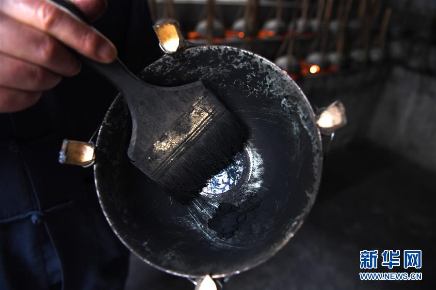 5月21日,安徽省非物質(zhì)文化遺產(chǎn)徽墨代表性傳承人項德勝收集集煙碗中的桐油煙灰。新華社記者張端攝。