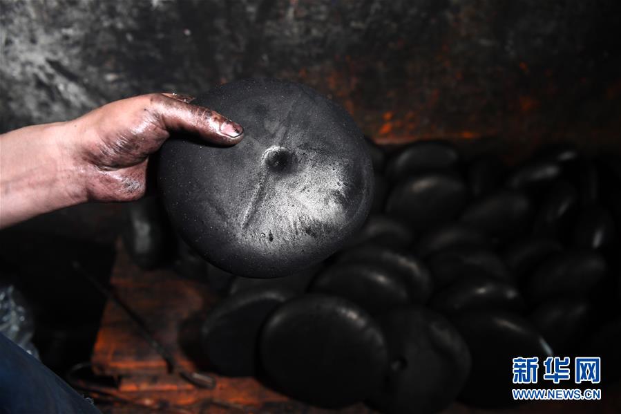 5月21日,安徽歙縣“項氏徽墨”的工人在查看墨餅。墨餅經(jīng)過加熱融化,再進(jìn)行捶打,制作成墨胚。新華社記者張端攝。