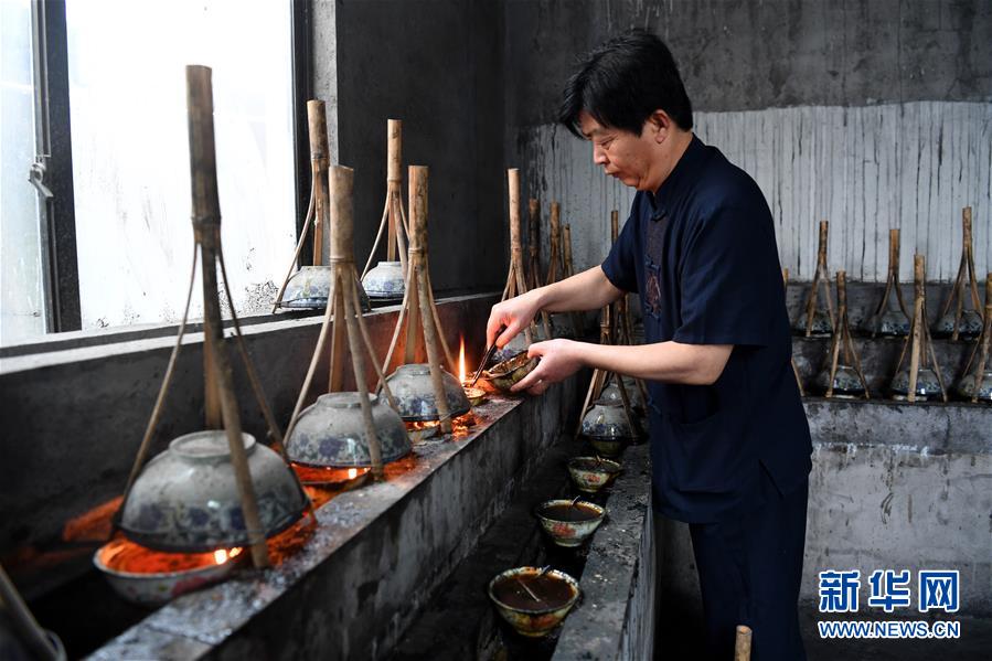 5月20日,安徽歙縣“項氏徽墨”的工人在熬膠。熬好的骨膠和煙灰混合后制作成墨泥。新華社記者劉軍喜攝。