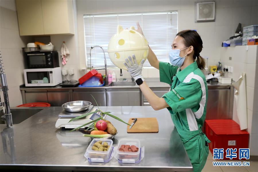 香港海洋公園的工作人員給大熊貓“安安”擺放食物(5月11日攝)。新華社記者吳曉初攝