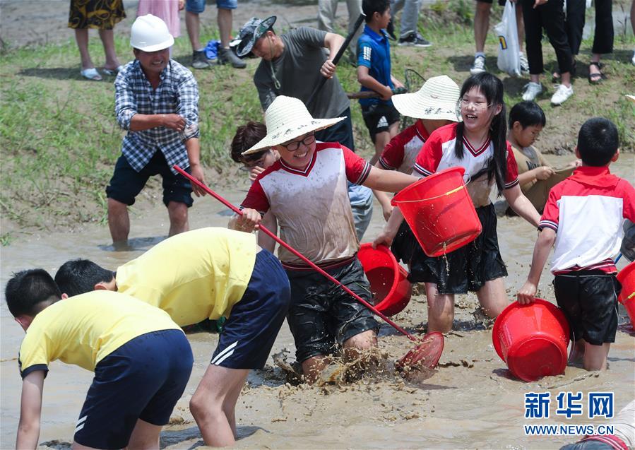 6月7日,孩子和家長們參加渾水摸魚趣味活動(dòng)。新華社記者徐昱攝