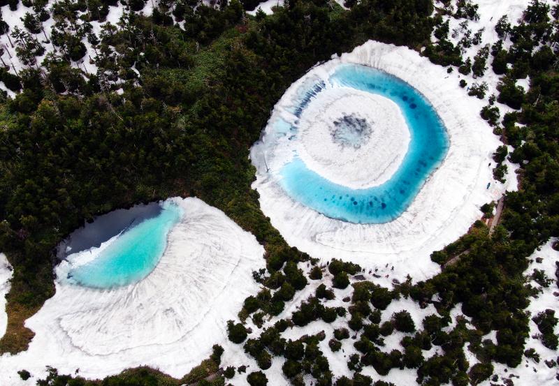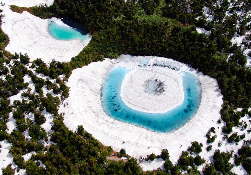 當?shù)貢r間2020年6月8日,日本,在橫跨巖手縣與秋田縣的八幡平山頂附近的“鏡沼”,伴隨著“鏡沼”的積雪從外側(cè)逐漸融化,外圍的碧藍色湖水與中心部的潔白積雪相映成趣,呈現(xiàn)出獨特的類似“龍眼”的景象。據(jù)悉,八幡平“龍眼”奇景只在每年5月下旬至6月初的雪融期間短暫出現(xiàn)。