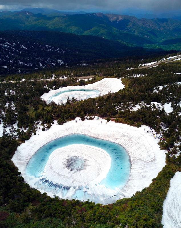 當地時間2020年6月8日,日本,在橫跨巖手縣與秋田縣的八幡平山頂附近的“鏡沼”,伴隨著“鏡沼”的積雪從外側逐漸融化,外圍的碧藍色湖水與中心部的潔白積雪相映成趣,呈現出獨特的類似“龍眼”的景象。據悉,八幡平“龍眼”奇景只在每年5月下旬至6月初的雪融期間短暫出現。