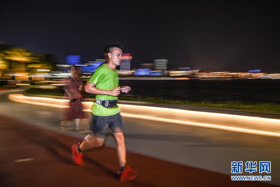 市民在海口萬(wàn)綠園夜跑(5月28日拍攝)。近年來(lái),夜跑成為越來(lái)越多都市人熱衷的健身方式之一。在海南??冢慨?dāng)夜幕降臨,“夜跑族”來(lái)到??谌f(wàn)綠園、世紀(jì)公園等夜跑場(chǎng)所跑步,用一身酣暢淋漓的汗水?dāng)[脫白天工作中的壓力,享受跑步帶來(lái)的歡愉。新華社記者 蒲曉旭 攝