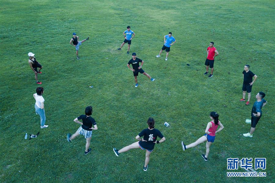 6月11日傍晚,在??谌f(wàn)綠園,市民在夜跑前做熱身運(yùn)動(dòng)(無(wú)人機(jī)拍攝)。近年來(lái),夜跑成為越來(lái)越多都市人熱衷的健身方式之一。在海南??冢慨?dāng)夜幕降臨,“夜跑族”來(lái)到??谌f(wàn)綠園、世紀(jì)公園等夜跑場(chǎng)所跑步,用一身酣暢淋漓的汗水?dāng)[脫白天工作中的壓力,享受跑步帶來(lái)的歡愉。新華社記者 蒲曉旭 攝