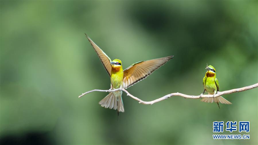 栗喉蜂虎在福建省晉江市深滬鎮(zhèn)科任村一山坡上覓食嬉戲(6月12日攝)。入夏以來(lái),逾百只栗喉蜂虎飛臨閩南晉江市深滬鎮(zhèn)科任村筑巢棲息。新華社記者記者梅永存攝。