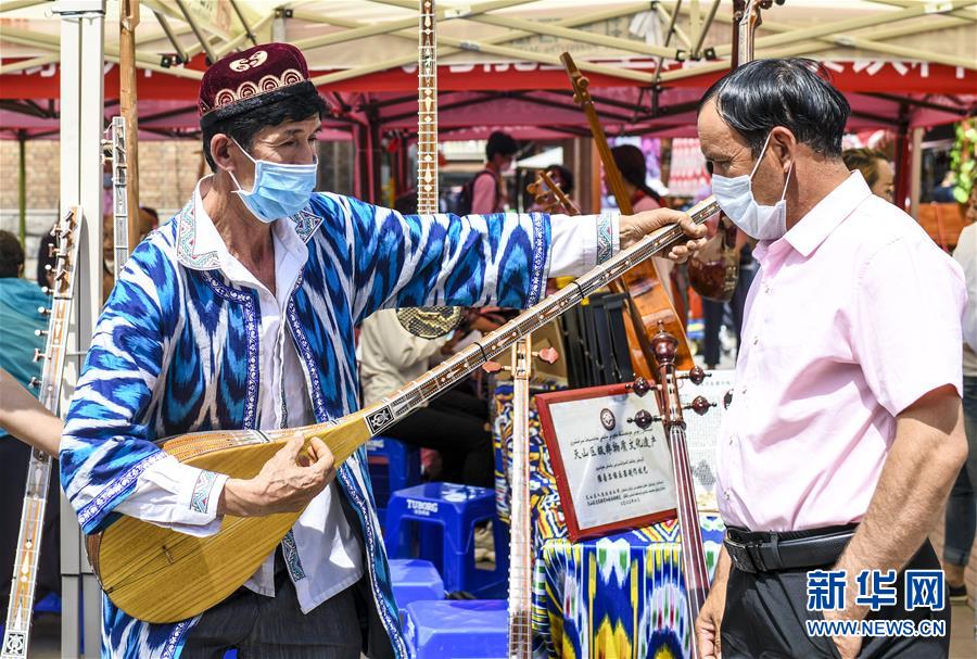 6月12日,在位于烏魯木齊大巴扎景區(qū)內(nèi)的活動(dòng)現(xiàn)場(chǎng),新疆維吾爾自治區(qū)非物質(zhì)文化遺產(chǎn)傳承人艾爾肯·吐么爾(左)在“維吾爾族樂(lè)器制作技藝”非遺項(xiàng)目展區(qū)演奏都塔爾。6月12日,“文旅融合,文物賦彩,非遺傳承,健康生活”2020年烏魯木齊市天山區(qū)文化和自然遺產(chǎn)日推介展演活動(dòng)在大巴扎景區(qū)舉辦,吸引不少游客和市民觀賞。新華社記者王菲攝。