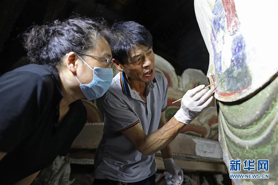 6月8日,工作人員對(duì)奉國(guó)寺的彩繪泥塑進(jìn)行保護(hù)修復(fù)。新華社記者 姚劍鋒 攝