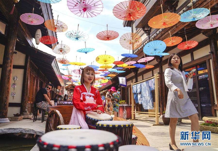 6月13日,在長(zhǎng)春市世茂蓮花山小鎮(zhèn)寬厚里商街,一名古裝愛(ài)好者演奏手鼓。當(dāng)日是“文化和自然遺產(chǎn)日”。吉林長(zhǎng)春首屆蓮花山消夏生活節(jié)在世茂蓮花山小鎮(zhèn)舉行?;顒?dòng)將非遺展示與假日消暑休閑相結(jié)合,讓游人在“古色古香”的油紙傘巷中品傳統(tǒng)文化魅力,享夏日休閑愜意。新華社記者 許暢 攝