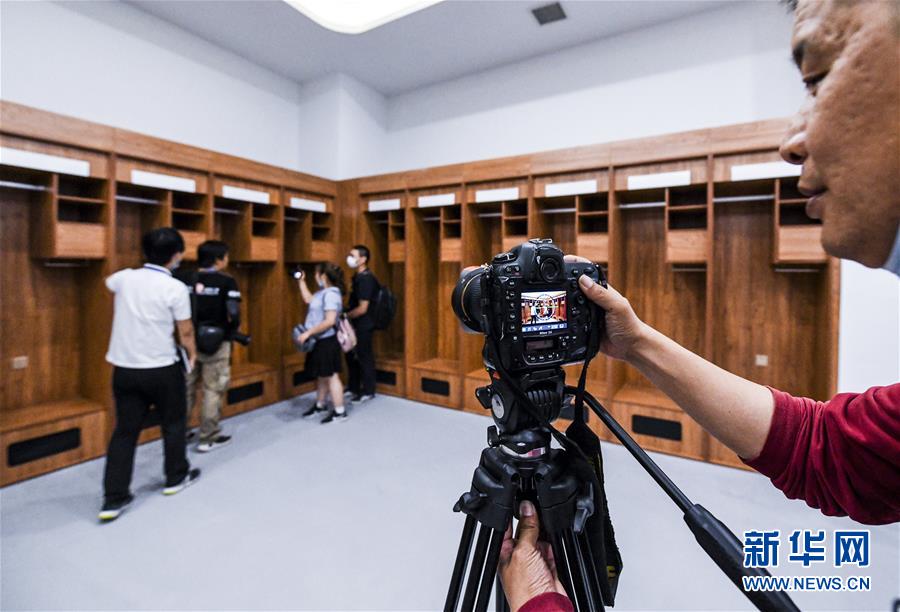 6月16日,在新疆烏魯木齊奧林匹克體育中心綜合體育館內(nèi),媒體從業(yè)者在拍攝運動員更衣室。新華社記者 王菲 攝